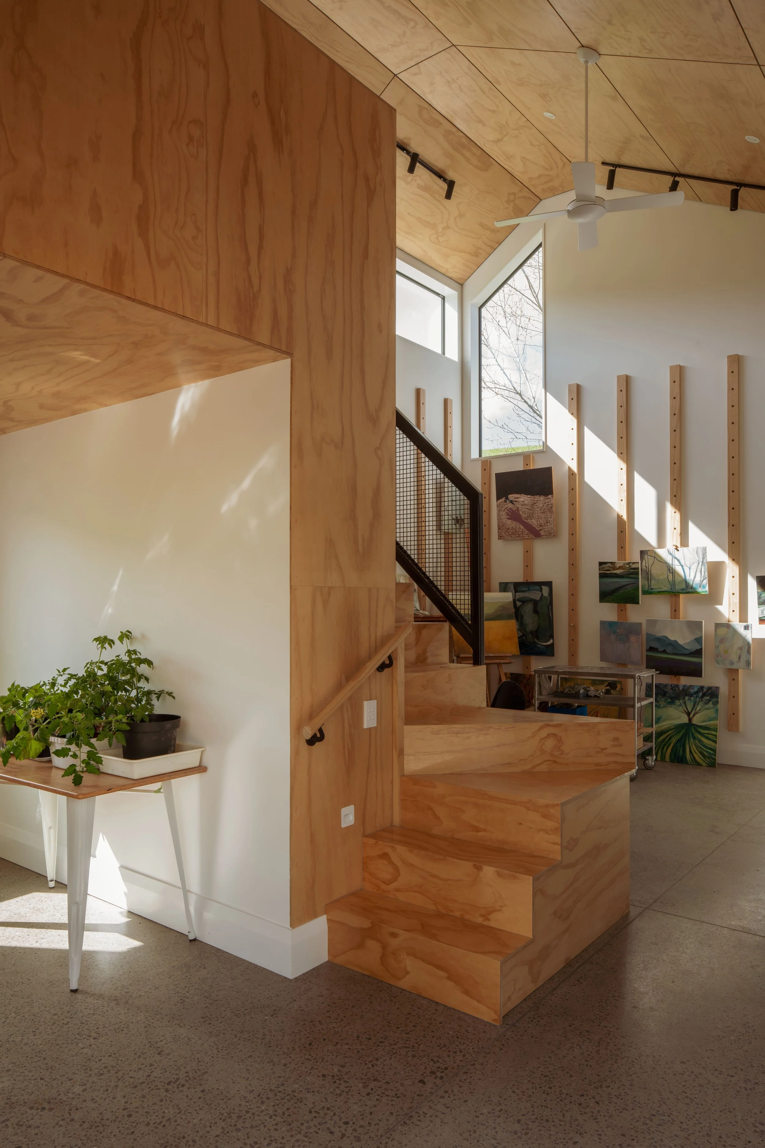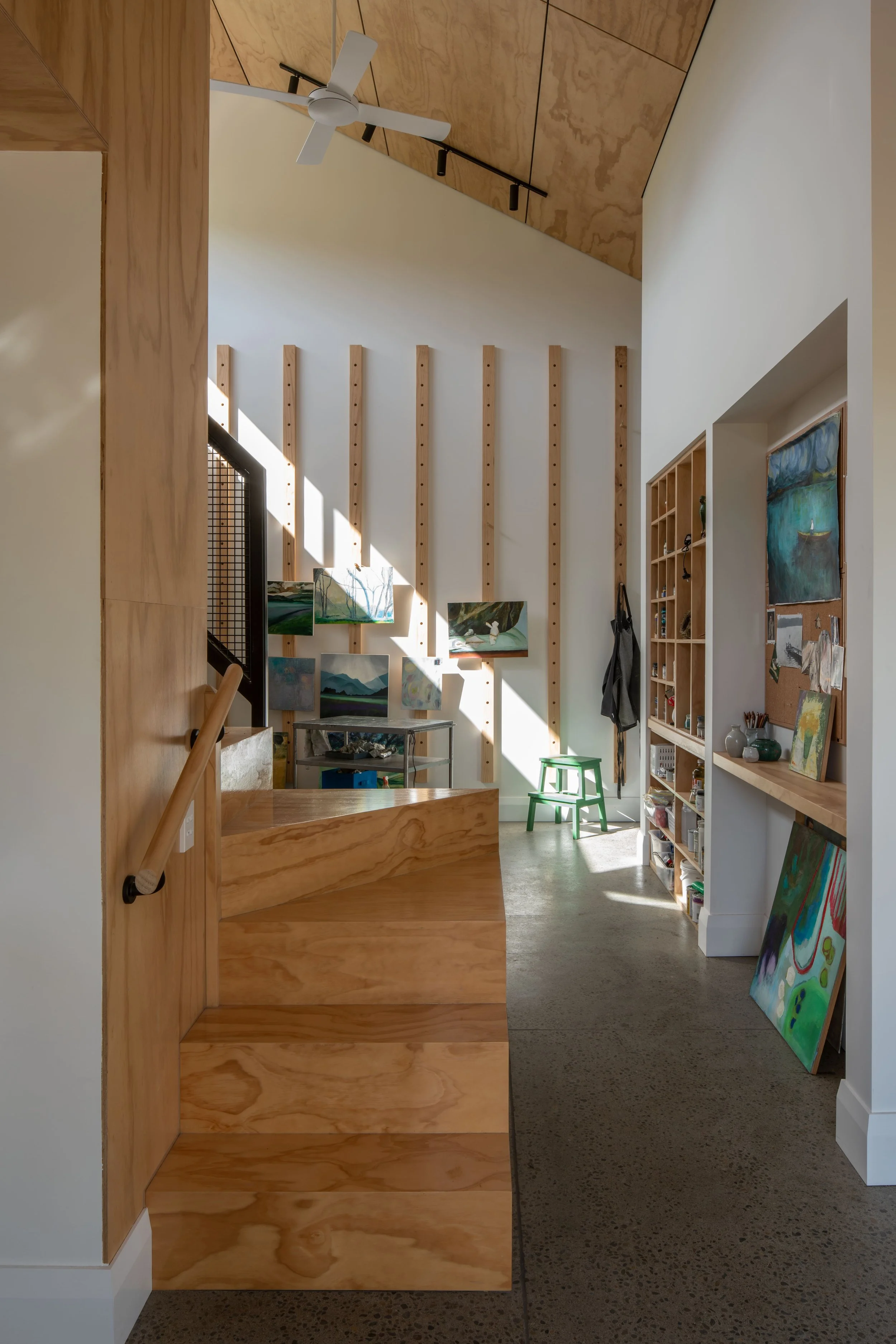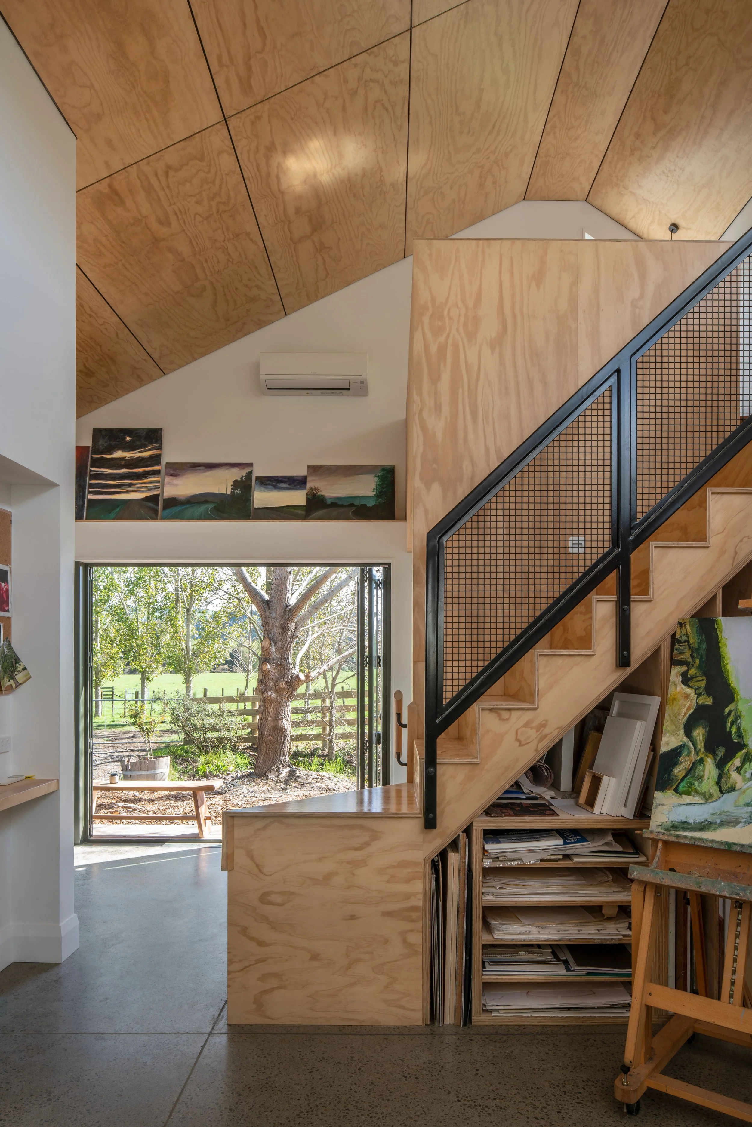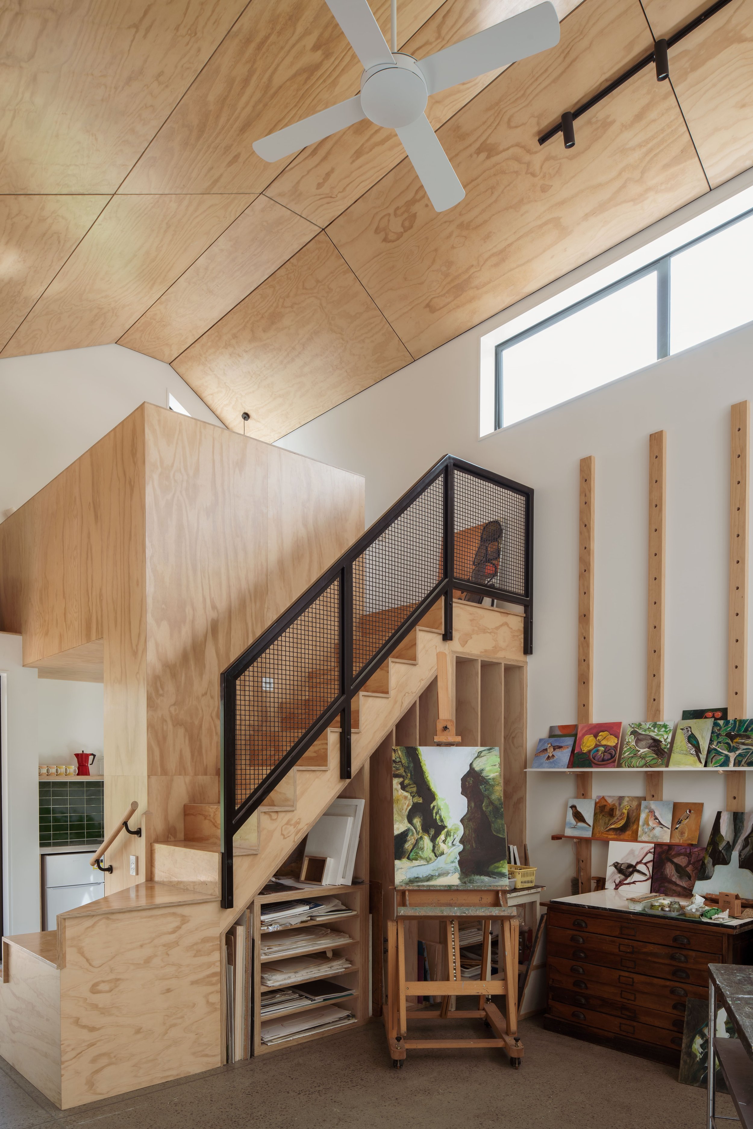 In a working artist’s studio, durability is a must-have. ‘There will be knocks, bumps, paint splashes and movement of canvases and materials. Plywood can handle that. In fact, those marks become part of the patina; they contribute to a lived-in, working aesthetic that suits an art studio.’