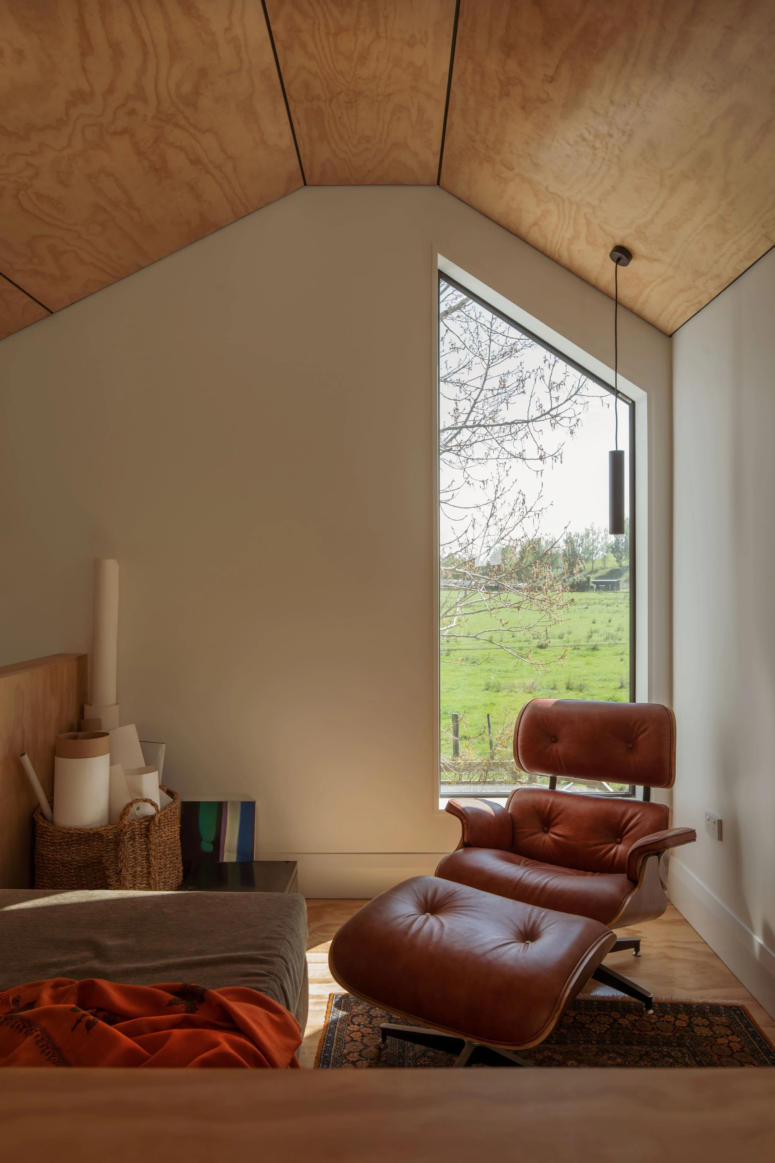 Katie started the design development with a simple box, then ‘cut’ into it, creating indents and diagonal roof lines that echo the rolling hills and valleys of the surrounding landscape. For the interior, she chose Bates PlyPlayTM in Naturally Naked, as both a lining material and the panel for several functional elements.