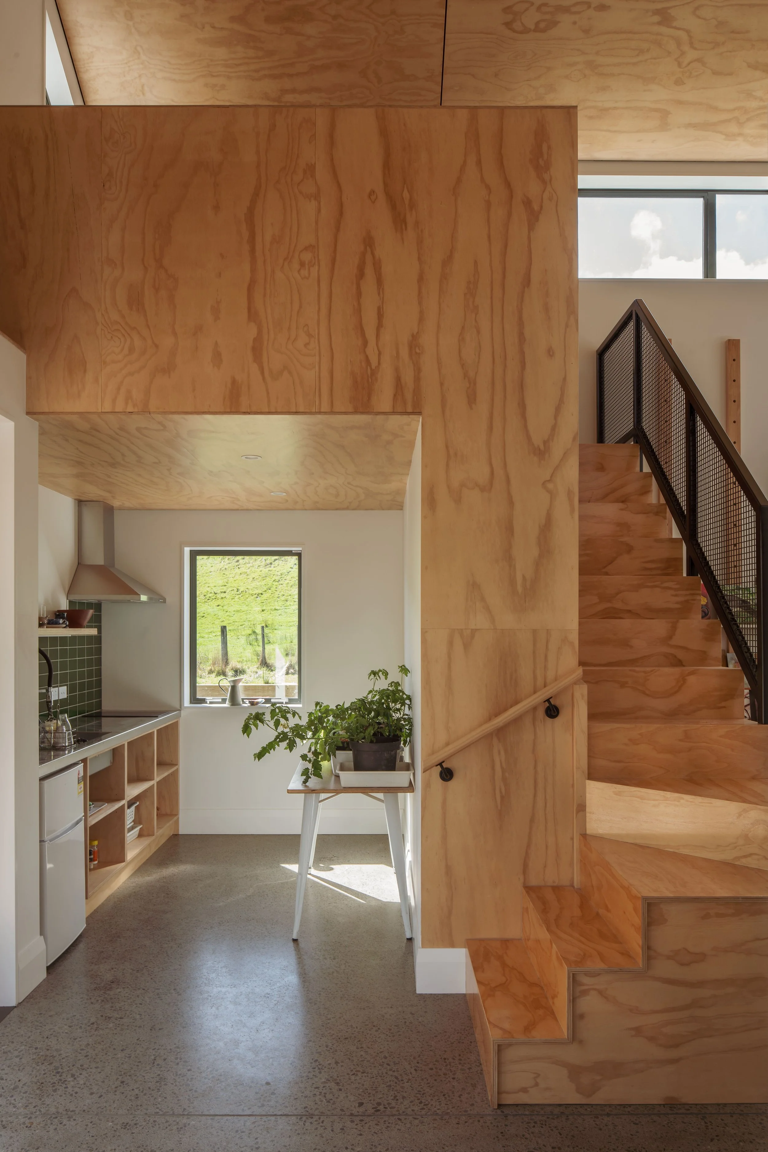 ‘We used prefinished PlyPlay extensively,’ says Katie. ‘It’s incredibly practical. It forms the ceiling, wraps the mezzanine, lines the underside of the kitchen area, shapes the stair, and makes up the mezzanine floor itself. It provides strength where needed – in the stairs, for example – but also works as a finished surface in its own right.’